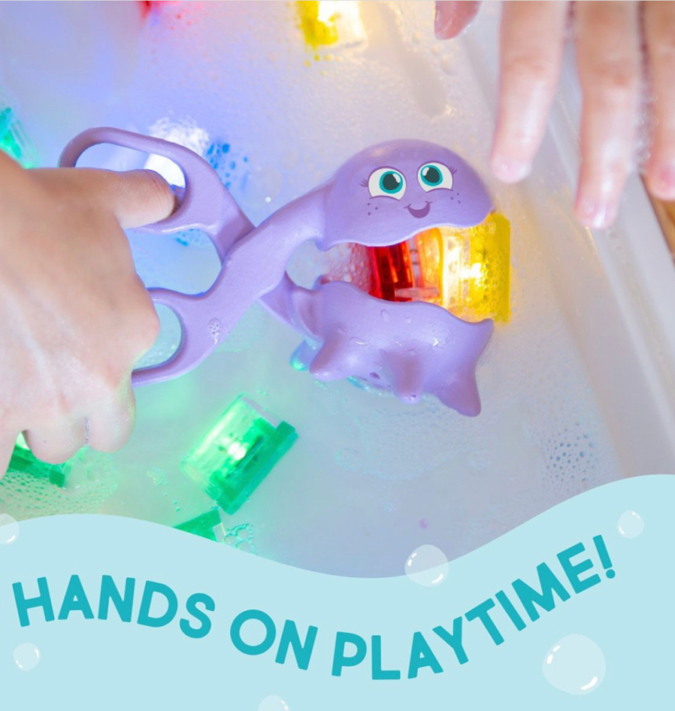 De sensory play toolset van Glo Pals is een vrolijke, kleurrijke en verrassend praktische set badspeelgoed voor kleine handjes met grote nieuwsgierigheid. Deze 3 sensorische tools stimuleren ontwikkeling, motoriek en fantasie tijdens elk badmoment of sensorisch spel. Ze hebben elk hun eigen functie. De Puffer Pal is een opvouwbare zeef die je kindje helpt om water te filteren en kleine voorwerpen uit het bad te vissen. De Tiny Tang, een schattige schelpvormige tang, is perfect om te oefenen met grijpen en sorteren. En dan is er nog de Scooper Squid, een multifunctioneel inktvisje dat uiteenvalt in 2 handige schepjes. Elk figuurtje is gemaakt van gerecycled kunststof van medische kwaliteit.
