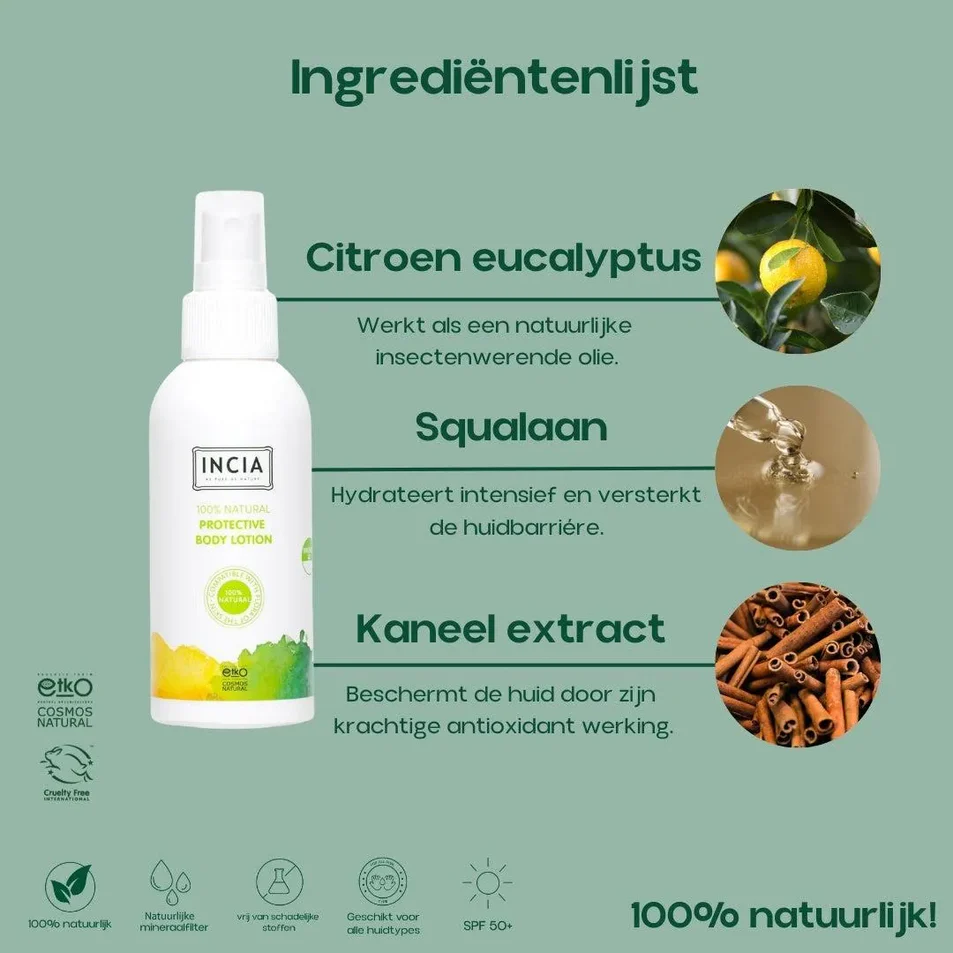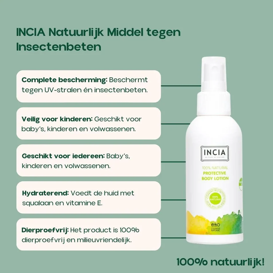 Naast beschermende eigenschappen heeft de INCIA Natuurlijk Middel tegen Insectenbeten ook hydraterende en verzachtende kwaliteiten. De lotion droogt de huid niet uit, maar voedt en hydrateert deze juist. Dit komt onder andere door de squalaan en vitamine E die het bevat. Door deze eigenschappen is INCIA Natuurlijk Middel tegen Insectenbeten hypoallergeen en ook heel geschikt voor de gevoelige huid.