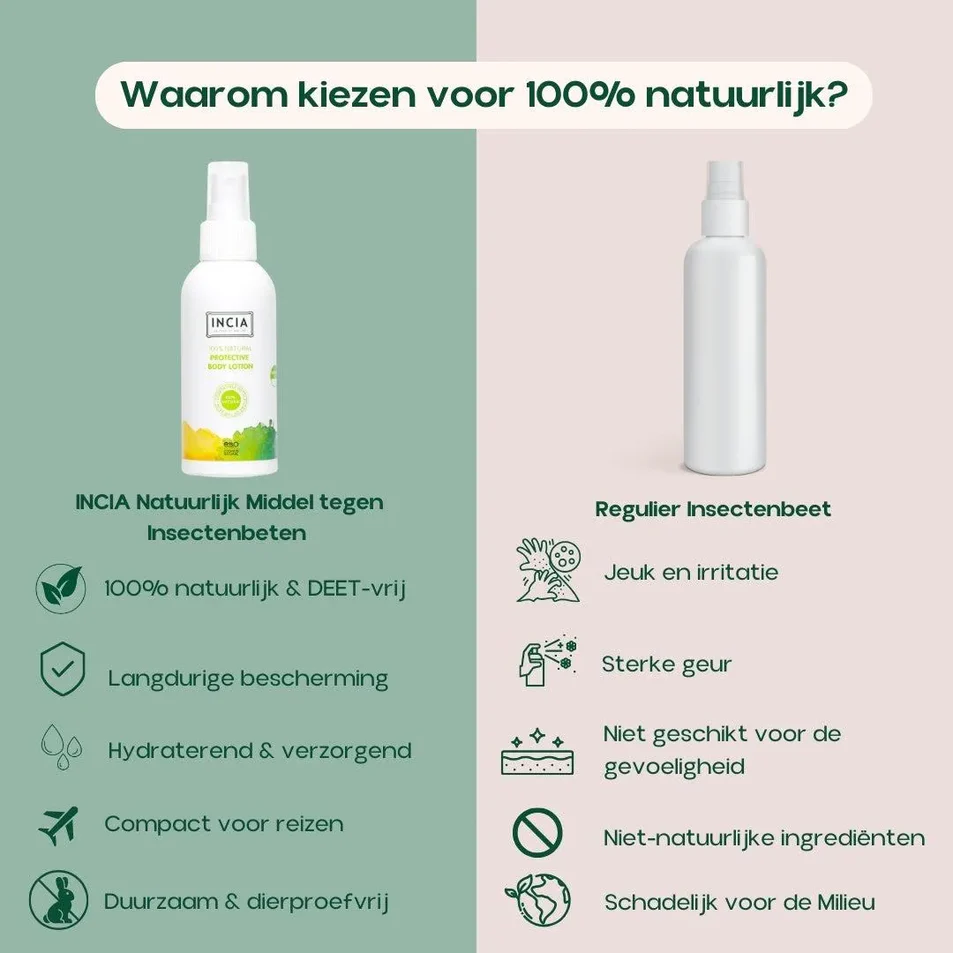 Veel anti-muggen en anti-insectenmiddelen bevatten agressieve, chemische stoffen. De bekendste hiervan is DEET. DEET is schadelijk voor de gezondheid. DEET mag daarom niet gebruikt worden door kwetsbare groepen, zoals zwangere vrouwen, vrouwen die borstvoeding geven of kinderen onder de dertien jaar. INCIA Natuurlijk Middel tegen Insectenbeten bevat geen DEET. Deze lotion is volledig veilig te gebruiken. De natuurlijke ingrediënten in INCIA Natuurlijk Middel tegen Insectenbeten zijn zelfs geschikt voor het kwetsbare immuunsysteem van baby’s.