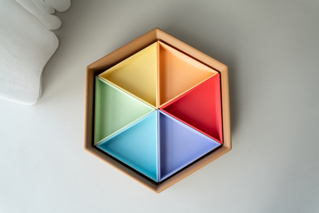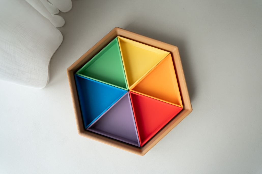 De Mandigo zeshoekige speelbak van Grennn is met veel zorg ontworpen om spelmateriaal overzichtelijk en uitnodigend te presenteren. De herkenbare zeshoek biedt een rustige basis waarin kinderen direct zien wat waar ligt. Dankzij de losse inlegdriehoeken, die per kleur verkrijgbaar zijn, kun je de indeling helemaal naar wens samenstellen. Zo creëer je een vorm en kleurenpalet dat past bij jouw collectie of bij het spel dat je wilt ondersteunen.