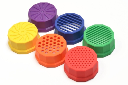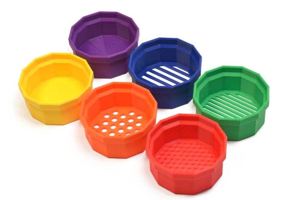 Naast het sorteren nodigt de Zeefjesset uit tot creatief experimenteren. Maak afdrukken in kinetisch zand of klei, of gebruik de set buiten om te spelen met zand en water.